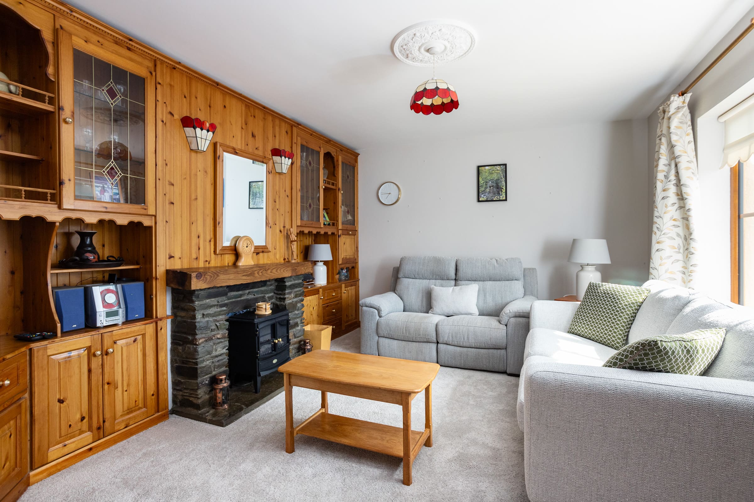 The inside is arranged with a large and wide entrance hall with it’s 2 reception rooms accessible either side. The cosy sitting room has hand-crafted paneling and storage along with a large south facing window and fireplace.
