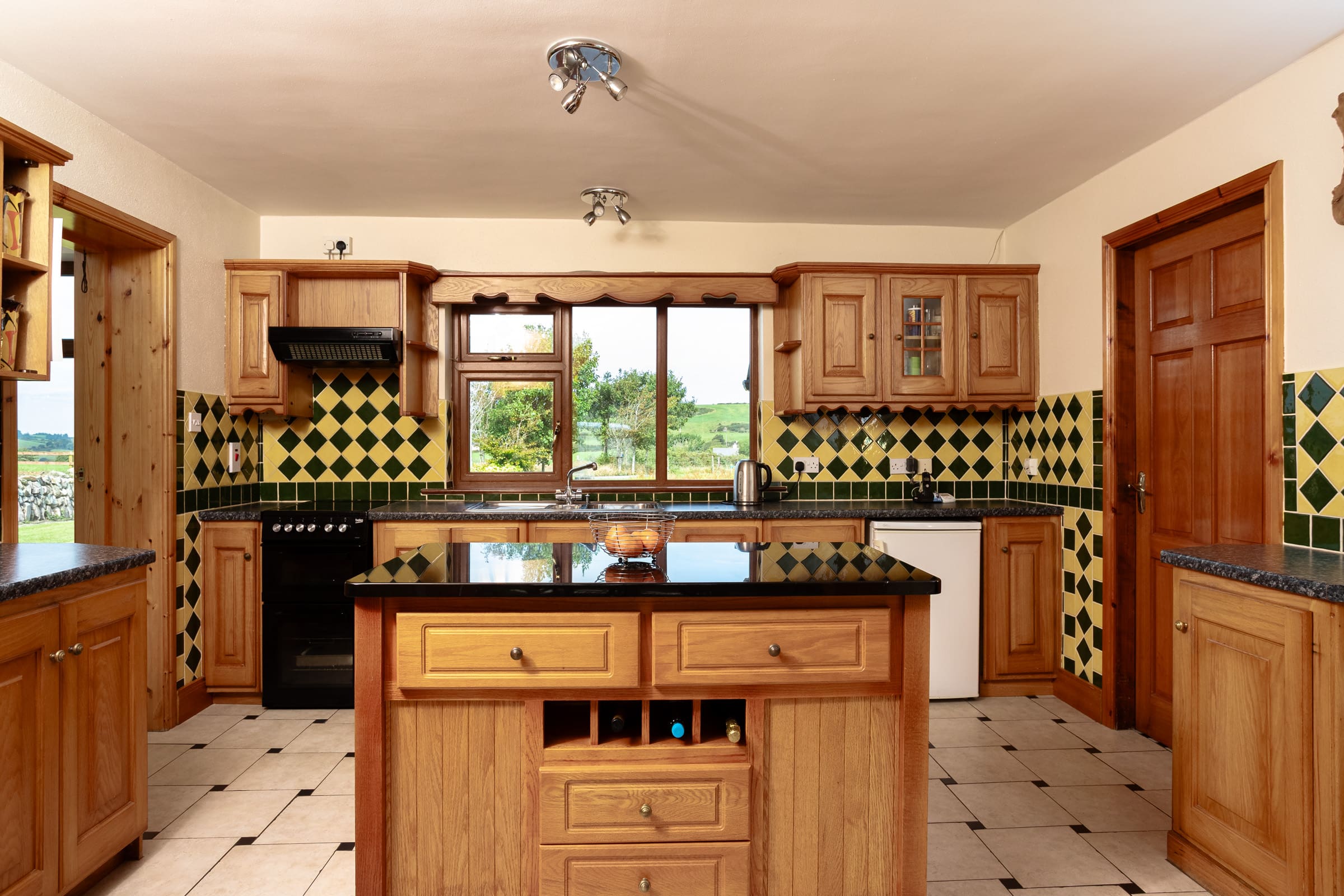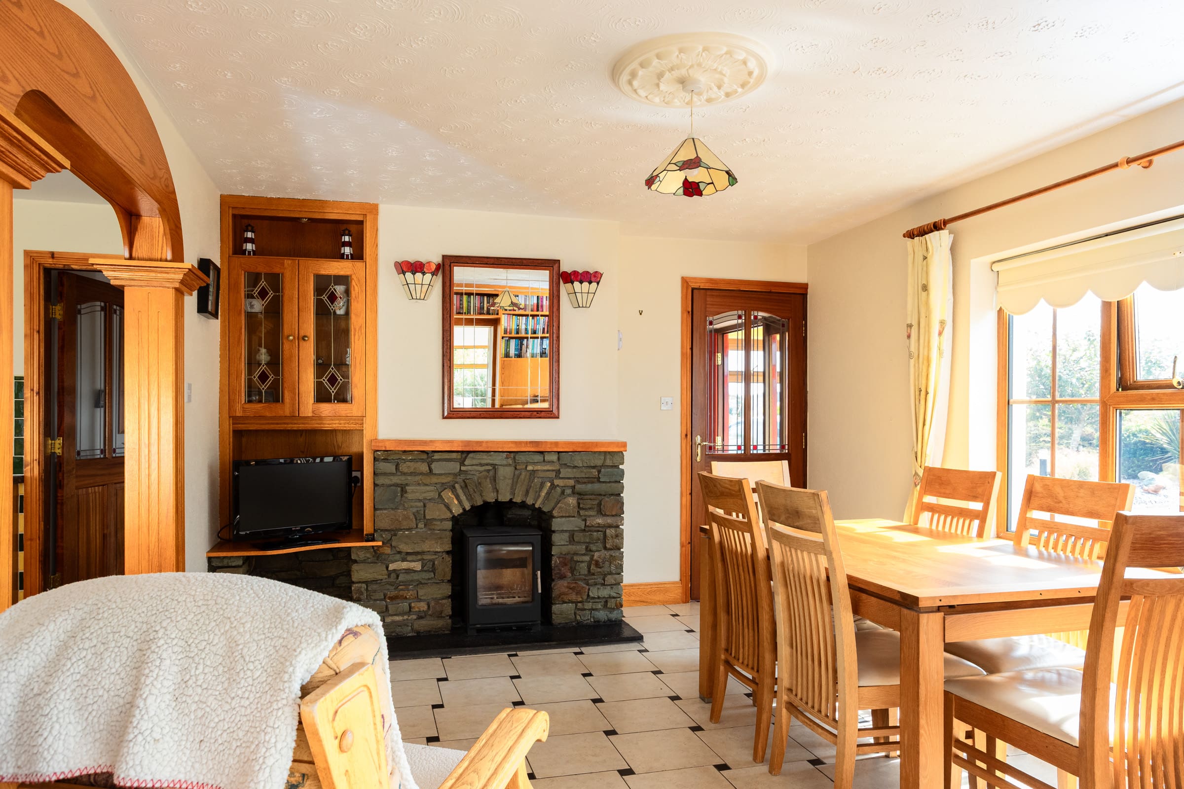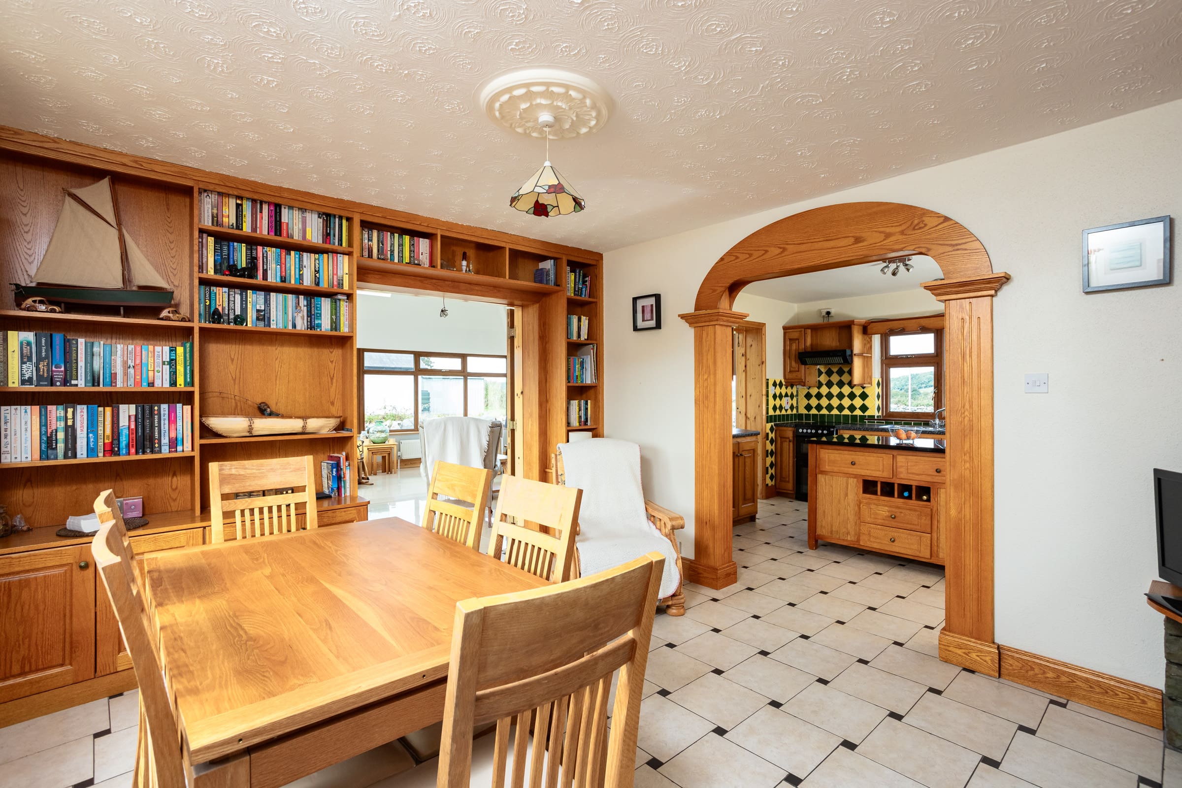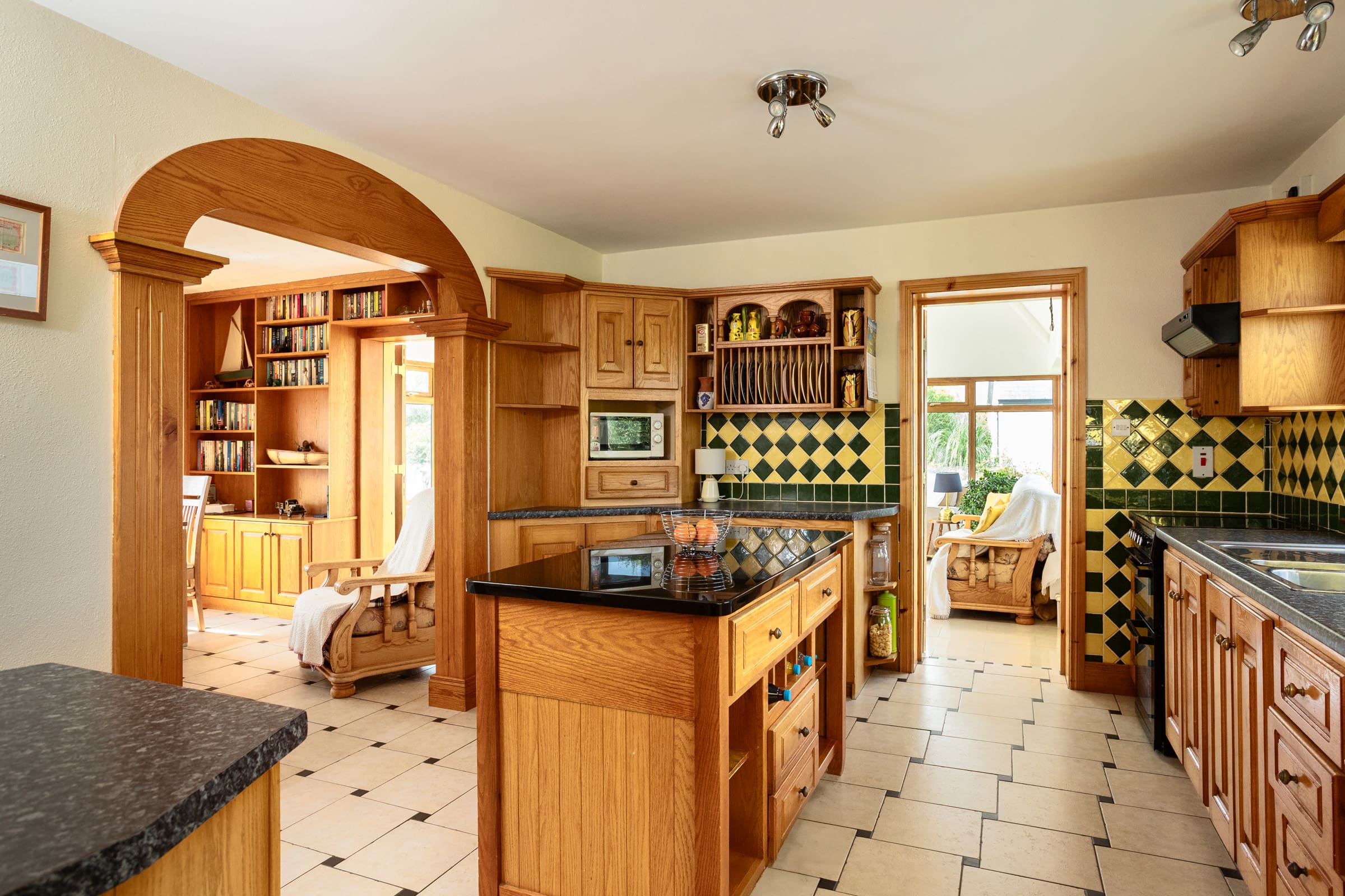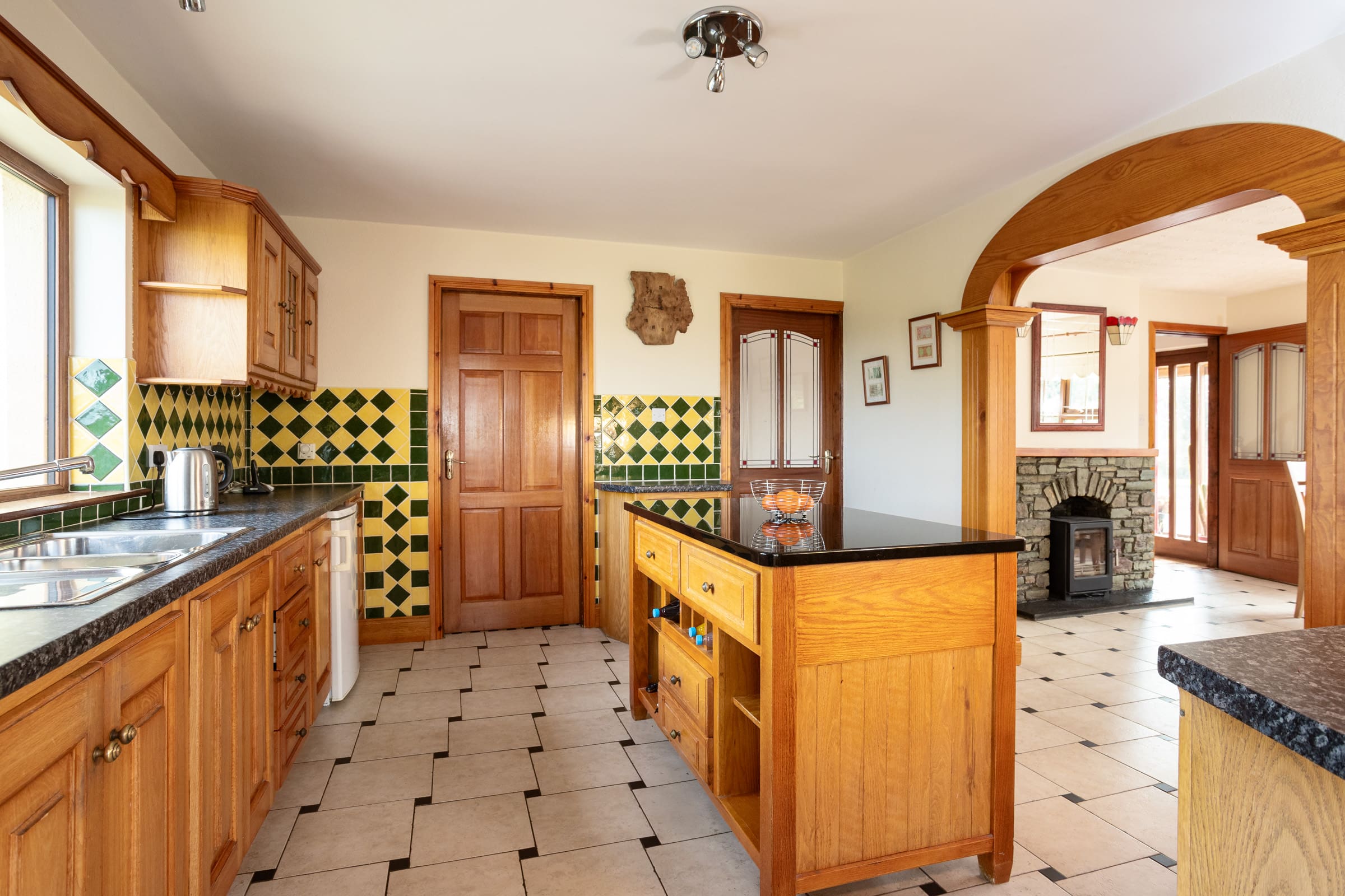 The dining room also features a cast-iron solid fuel stove and hand-crafted built-in solid Oak joinery including the central arched opening to the kitchen. The kitchen benefits from this open-plan layout being light filled with a practical and convenient layout whilst having beautiful uninterrupted countryside views from the kitchen sink.