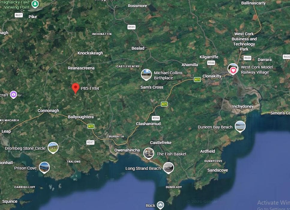 Located just North of the N71,part of The Wild Atlantic Way, the property is well connected, the ever popular towns of Clonakilty, Skibbereen, Rosscarbery are close by, a choice of beaches just a 15 minute drive,an hourly bus service on your doorstep..