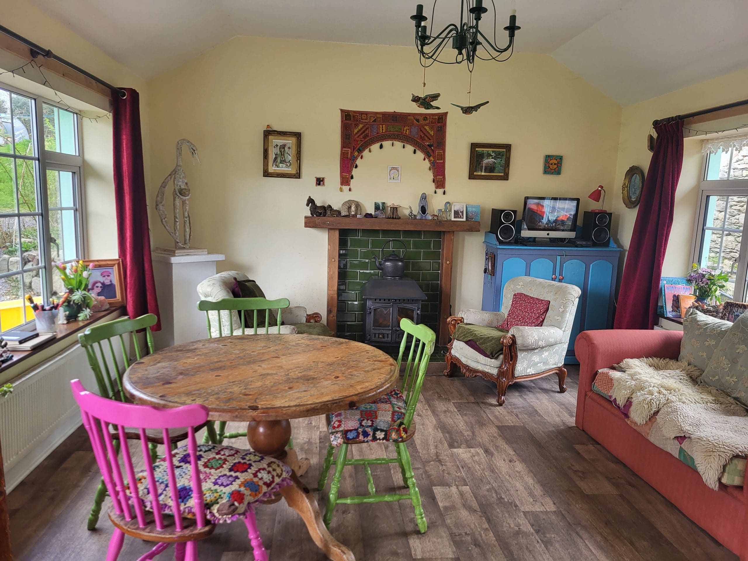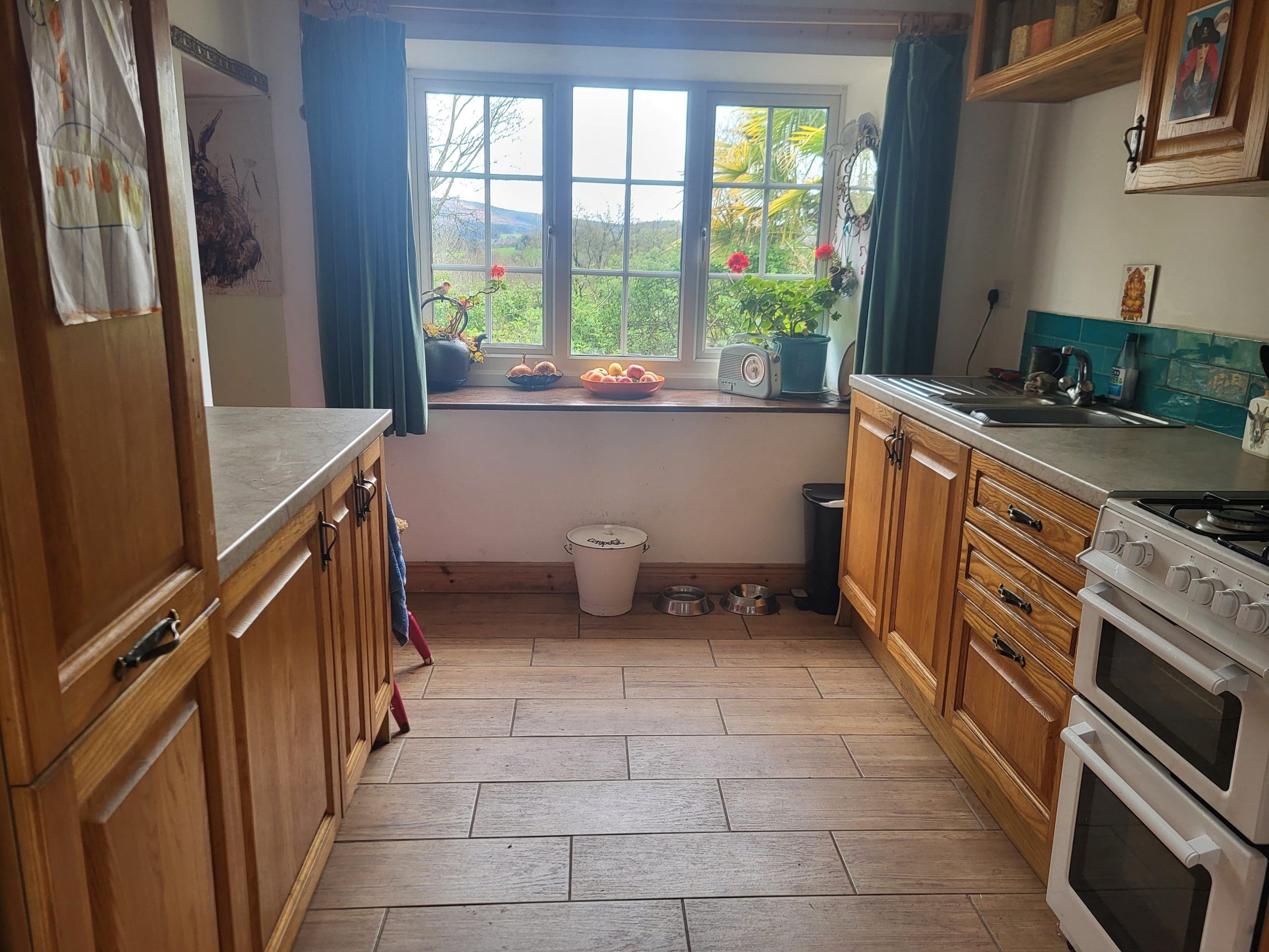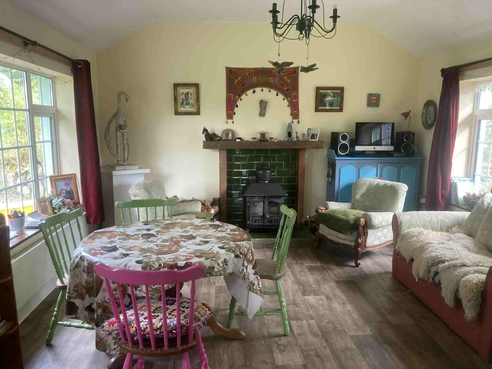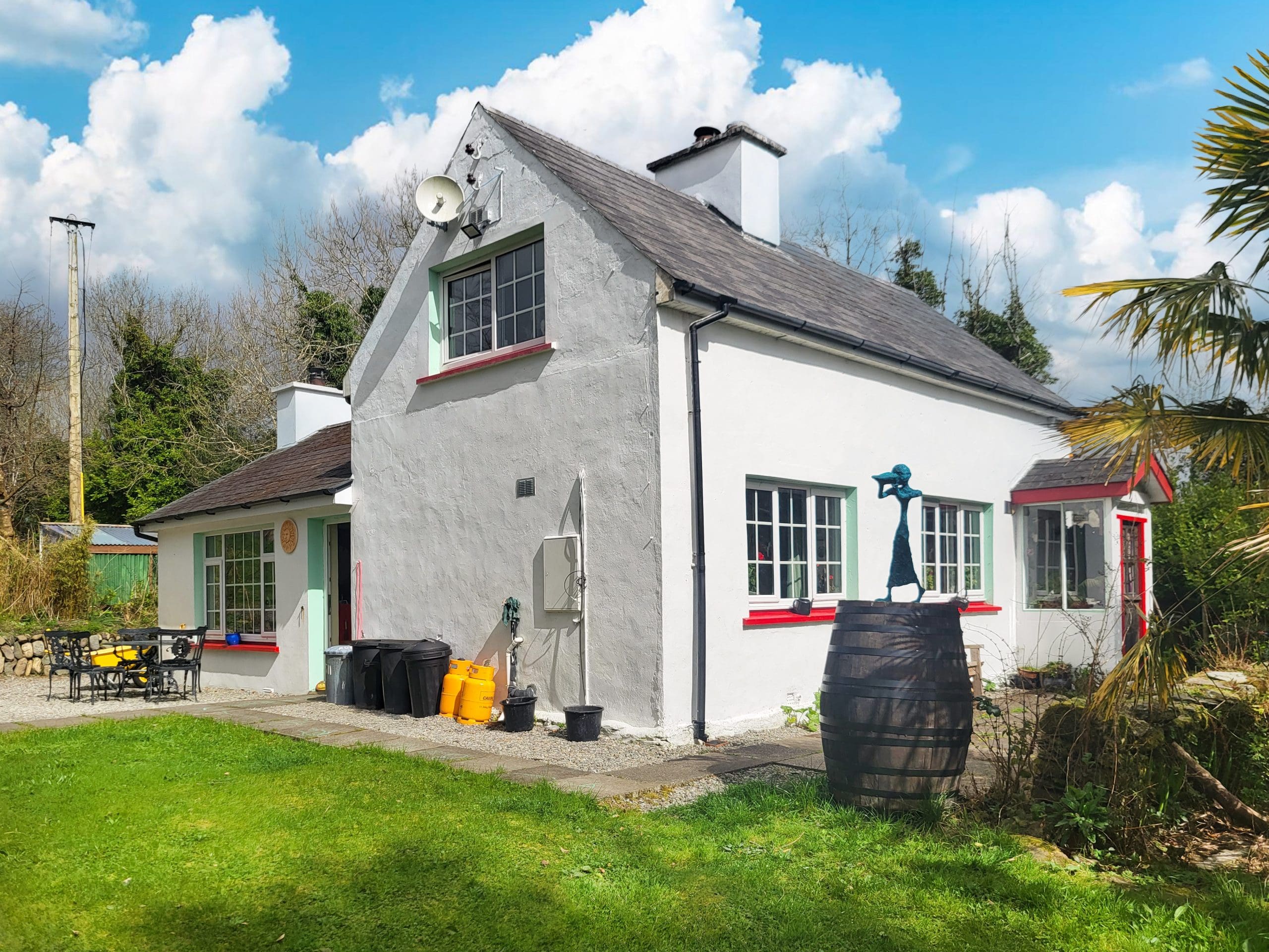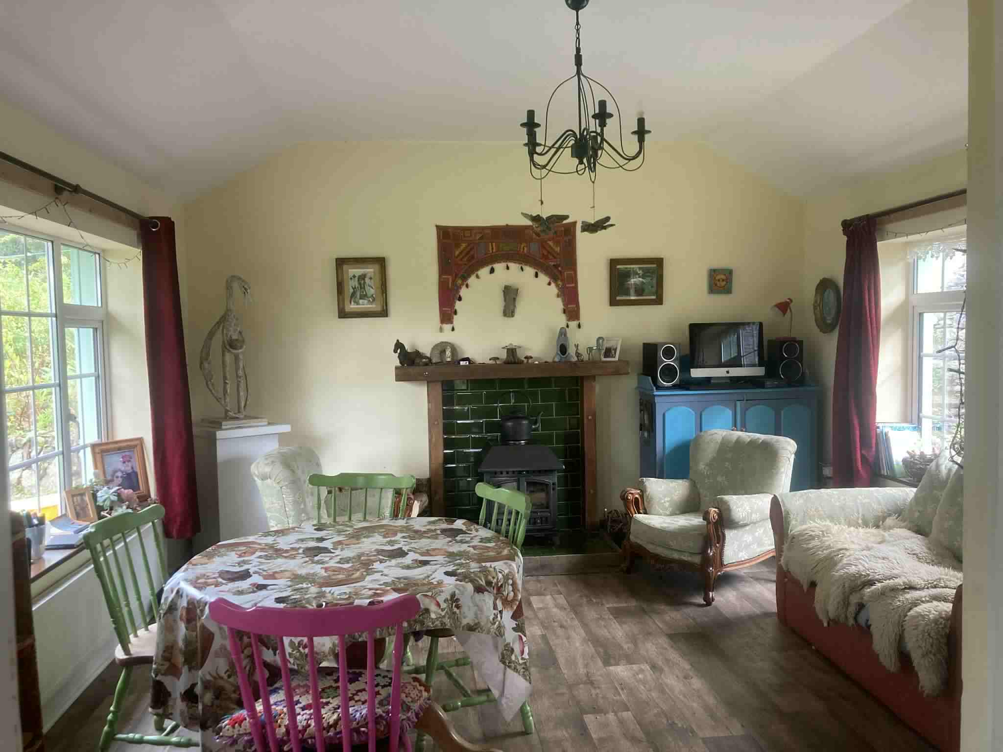 Charming Traditional Style 2 Bed Country Cottage On C.1 acre small holding. This extended Cottage is a nicely situated, well maintained and tastefully decorated traditional style country cottage. The residence has been extended, offering spacious living accommodation with modern conveniences, yet retains many of the traditional features. The residence has a southerly aspect and stands on a mature C.1 acre site, with hedging and well established trees to the boundaries, while small pathways connect mature apple trees, wooded areas, kids play area, with rose, flower and shrub beds interspersed throughout the garden. Within this lovely mature site are further buildings, a modern fully insulated steel framed and clad studio, (6 m x 4 m) ; original single storey stone built storehouses, which are also insulated; and a large purpose built woodshed. There is a south facing organic vegetable garden, soft fruit bushes, and the possibility of purchasing a very large, 15 x 42 foot , polytunnel should that suit . Part of the property is in the second year of a rewilding project. The extended cottage is cosy, warm and light, located in a quiet rural location, 9 km to the north west of the market town of Dunmanway. The surrounding landscape comprises of undulating pasture lands, wooded hillside and mountain views in all a very desirable countryside location.